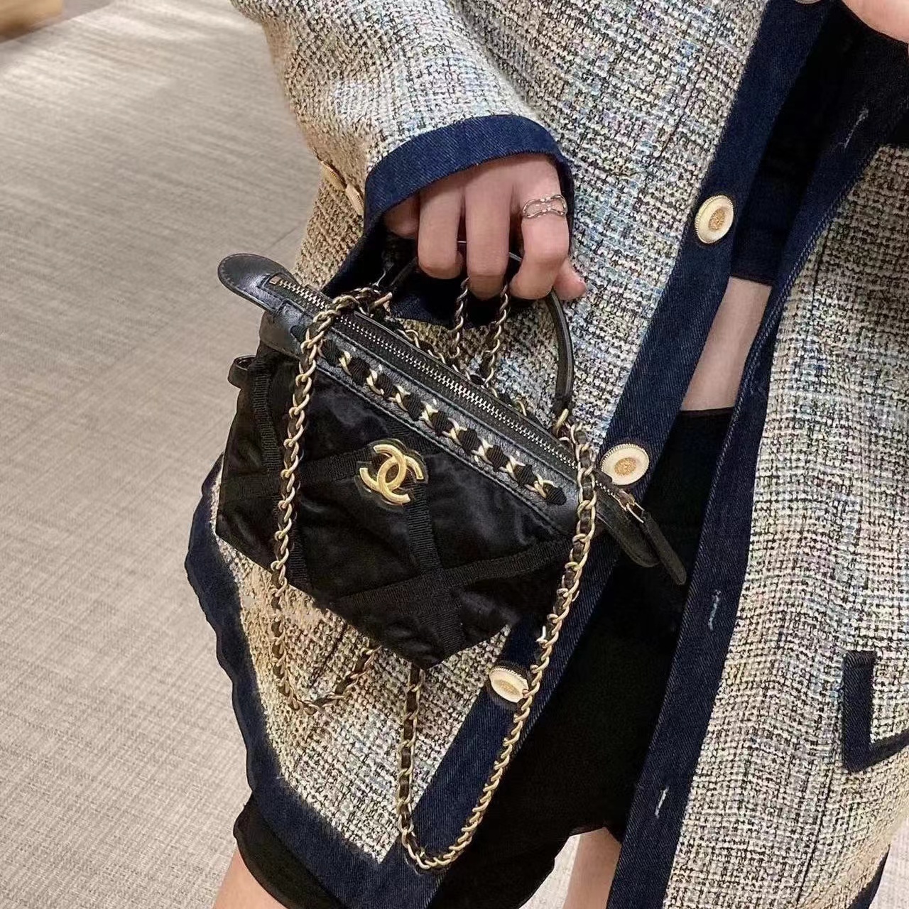 CHANE1 ブラック ゴールド サテン ハンドバッグ【50%割引+送料無料】